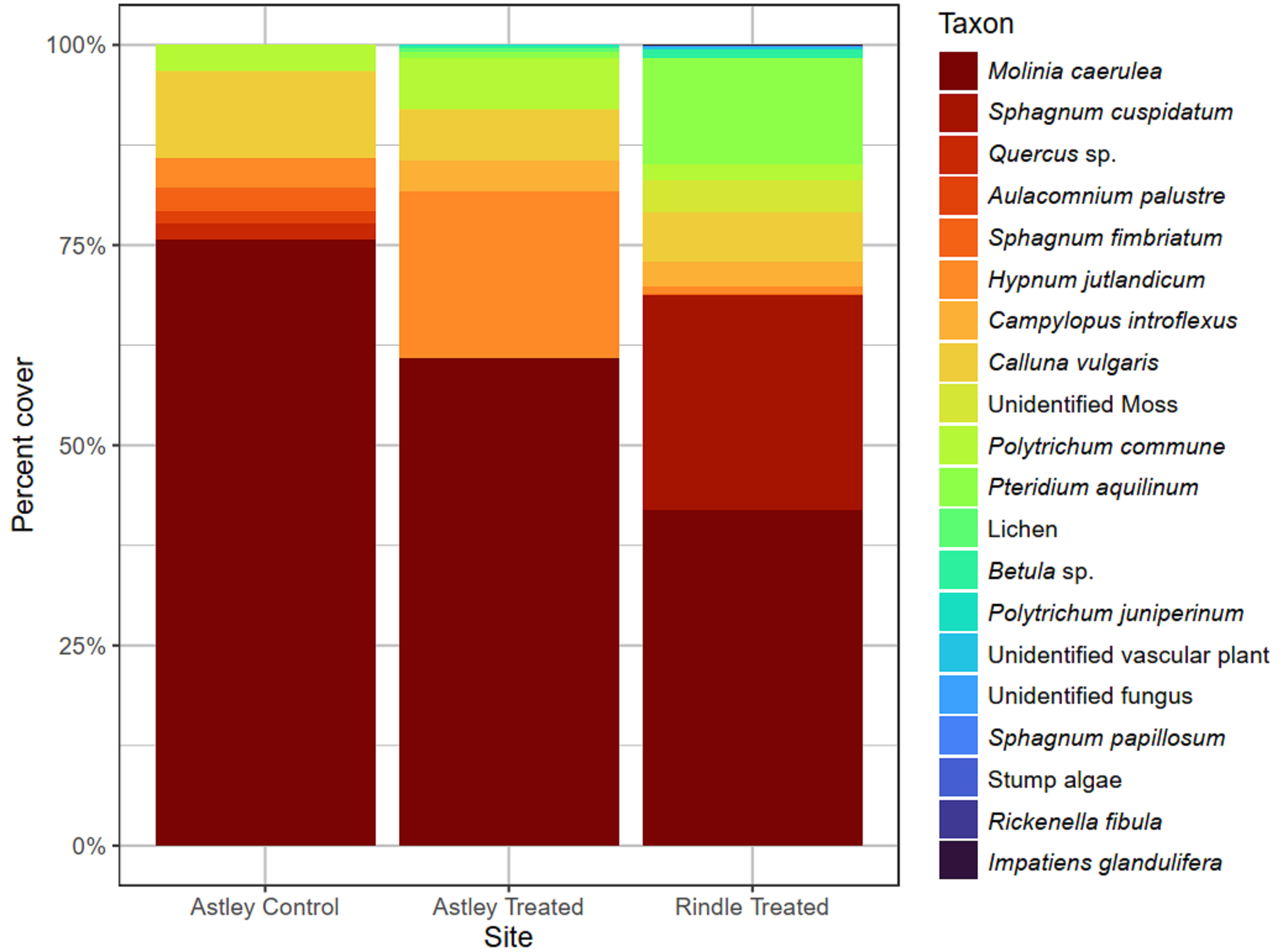 Mulching reduced the dominance of Molinia at treated sites, increasing floristic diversity and wetland indicator species. However, low water table at Astley limited Sphagnum growth, while inundation at Rindle allowed Sphagnum to compete with Molinia. Raised bog vegetation requires a high water table, so mulching alone was not sufficient in restoring peat function. At Rindle, relationships between vegetation and nutrients indicated slowed decomposition and peat-forming processes, and Molinia increasing peat nutrients. Continued monitoring, and research further exploring the peat-water-vegetation interface is recommended.